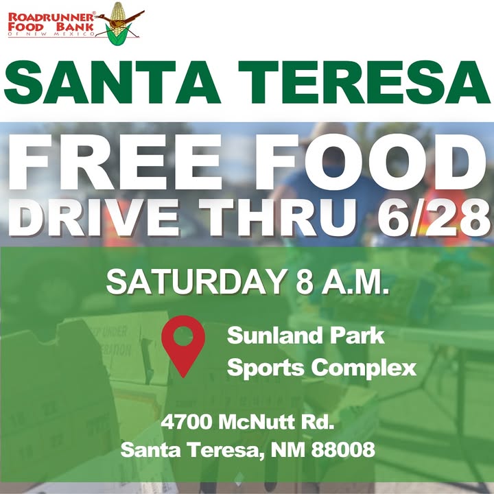 Roadrunner Food Bank of New Mexico will host a free drive-thru food distribution on Saturday, June 28. The event will take place at the Sunland Park Sports Complex, located at 4700 McNutt Rd., Santa Teresa, NM 88008. The distribution will begin at 8 a.m.